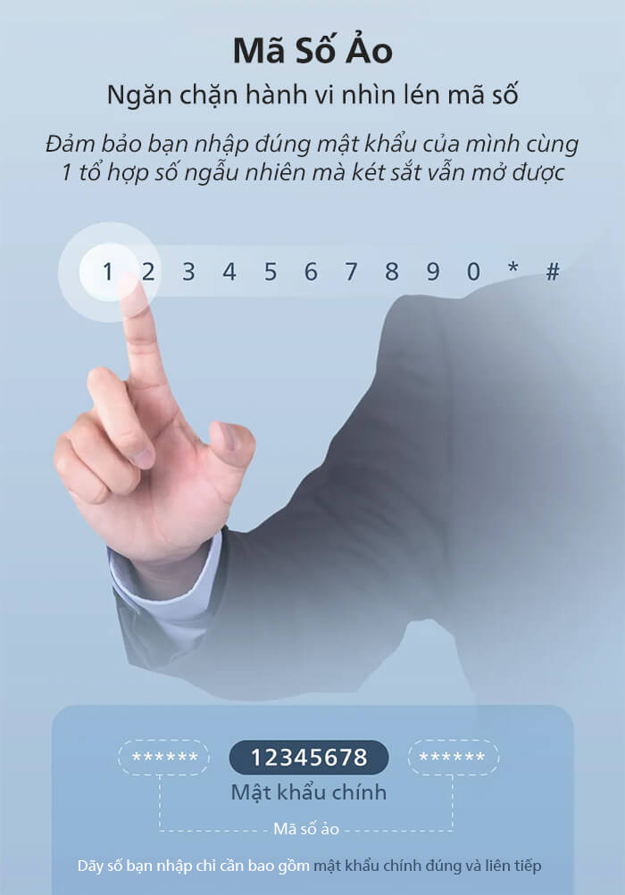 - Mở khóa bằng mã số: Hệ thống mã số hiện đại cho phép bạn thiết lập mật khẩu cá nhân, giúp bảo vệ tài sản một cách tối ưu. Bên cạnh đó, bạn có thể dùng tính năng mã số ảo để mở két trong trường hợp có người ở cạnh khi nhập mã số. Điều này giúp ngăn chặn hiệu quả rủi ro bị nhìn lén.