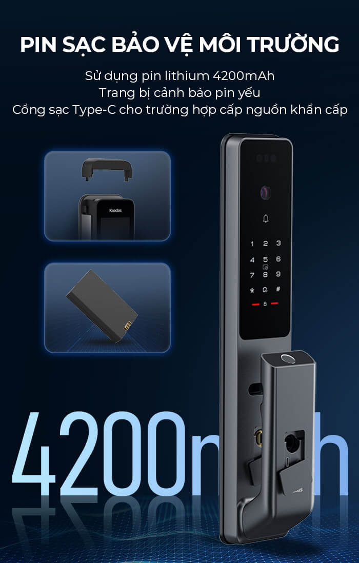 Khóa Cửa Điện Tử Kaadas Q9-FVP sử dụng pin sạc thay vì pin tháo rời. Dung lượng pin lớn lên đến 4200mAh. Bạn không cần lo lắng về chi phí thay pin thường xuyên cho khoá cửa.