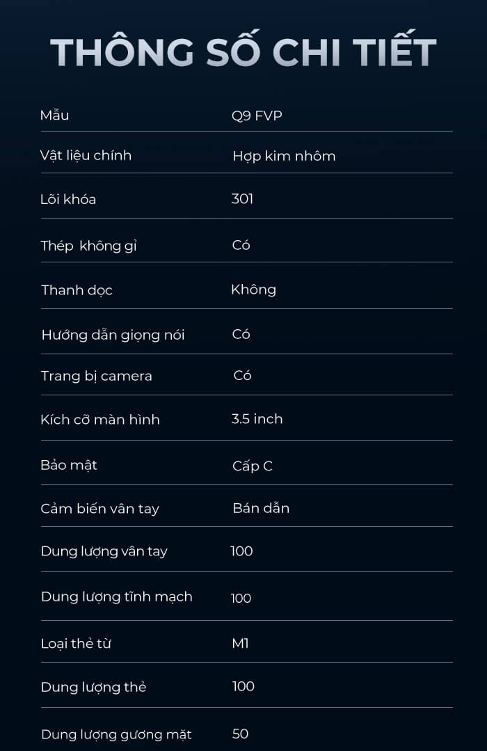 Khoá được trang bị nhiều tính năng mở cửa linh hoạt như tĩnh mạch, chuông hình, gương mặt, vân tay, mã số, thẻ từ, chìa cơ hay mở cửa từ xa. Điều này giúp người dùng sử dụng dễ dàng và tiện lợi hơn. Bên cạnh đó, khoá còn ứng dụng rất nhiều công nghệ hiện đại, nâng cao bảo mật cho ngôi nhà như: nhận diện vân tay FPC Thuỵ Điển, bảo mật kép, mã số ảo… Với thiết kế hiện đại, tính năng thông minh thì Q9 chính là giải pháp an ninh tiên tiến dành cho bạn.