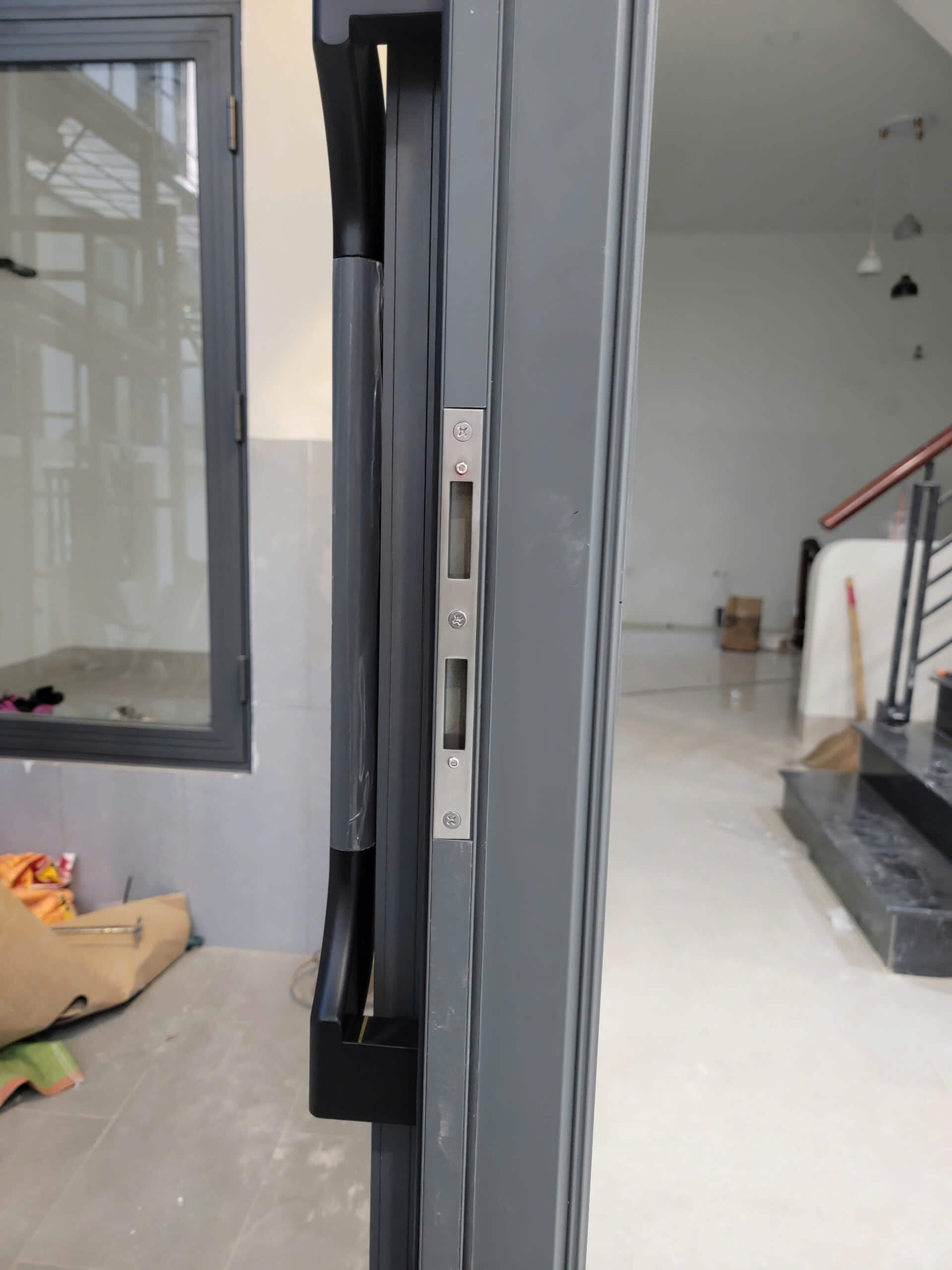 Cửa nhôm trượt lùa: Thân khóa mỏng, không cấn ray, thao tác kéo trượt dễ dàng.