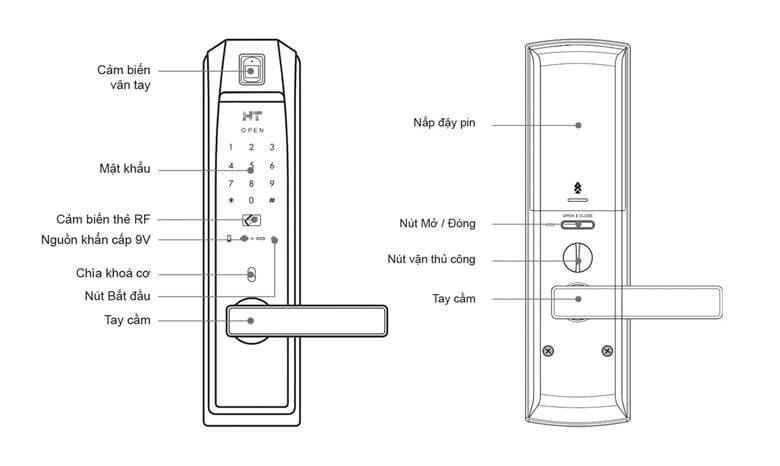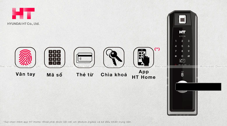 Khoá điện tử Hyundai HT với đa dạng cách mở khoá tiện lợi bao gồm: Vân tay, Mã số, Thẻ từ RF, Chìa khoá, App HT Home (tuỳ chọn lắp thêm module Zigbee và khoá phải kết nối với bộ điều khiển trung tâm)