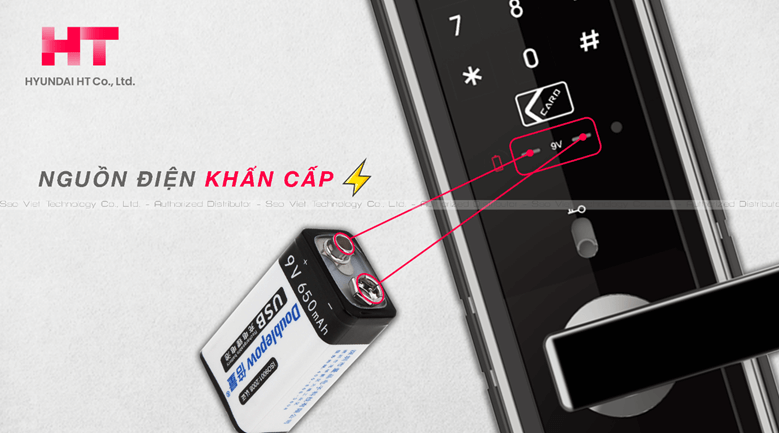 Trong trường hợp khoá hết pin đột xuất, khoá có thể được kích nguồn bằng viên pin 9V từ bên ngoài mặt khoá.