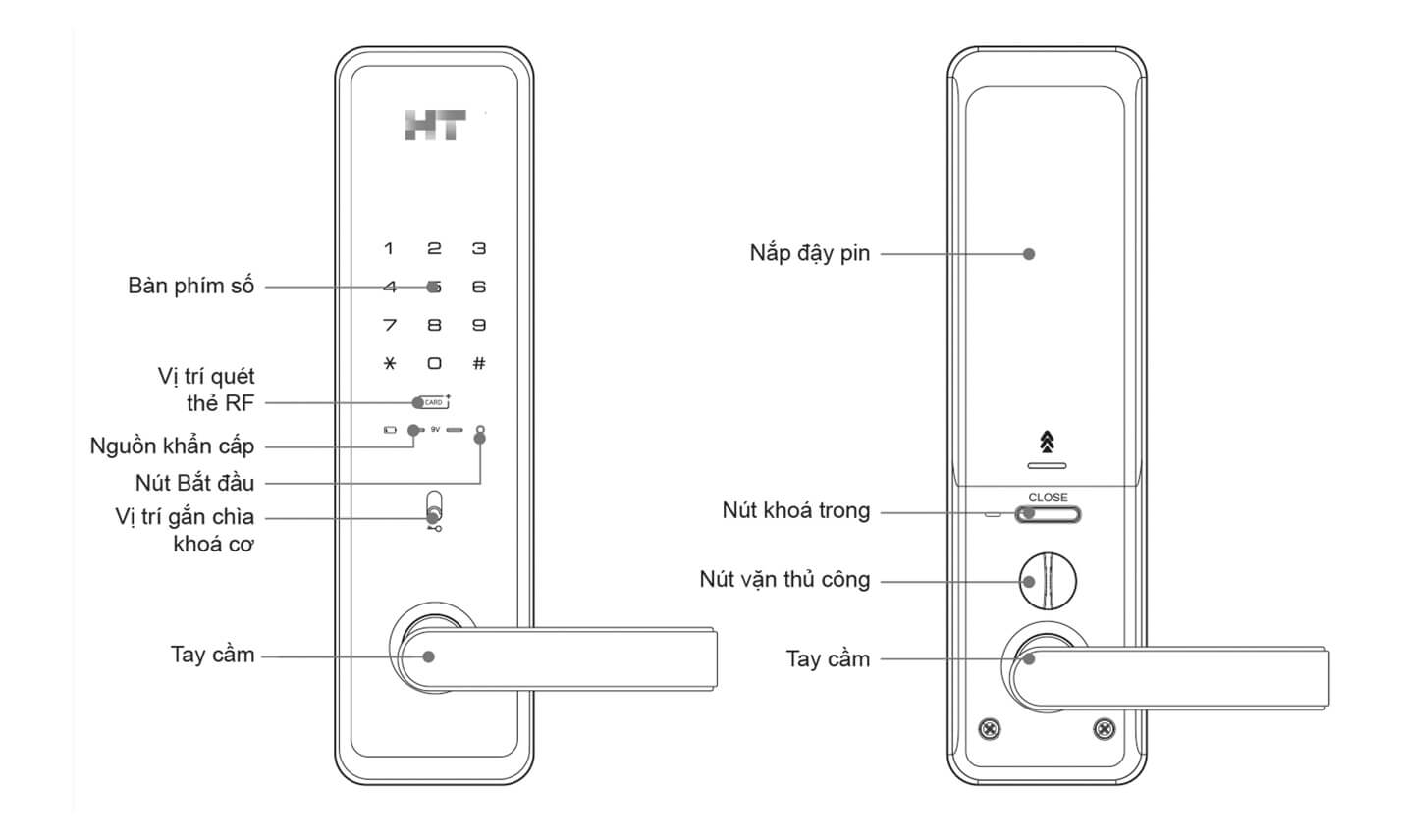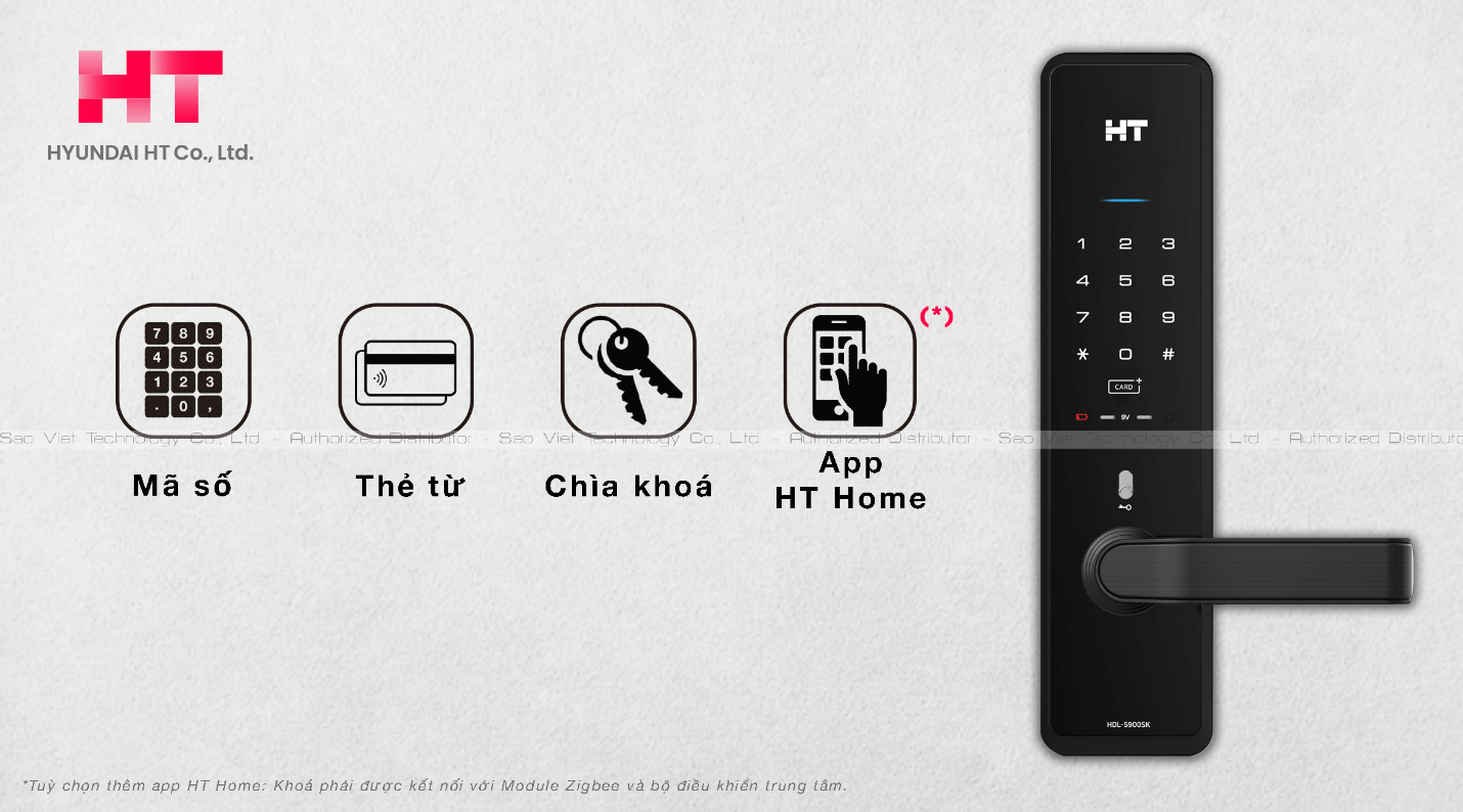 Khoá điện tử Hyundai HT với đa dạng cách mở khoá tiện lợi bao gồm: Mã số, Thẻ từ RF, Chìa khoá, App HT Home (tuỳ chọn lắp thêm module Zigbee và khoá phải kết nối với bộ điều khiển trung tâm)