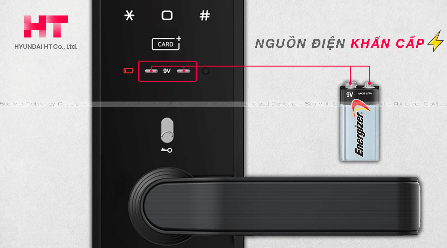 Trong trường hơp hết pin đột xuất, khoá có thể được kích nguồn bằng viên pin 9V từ bên ngoài mặt khoá.