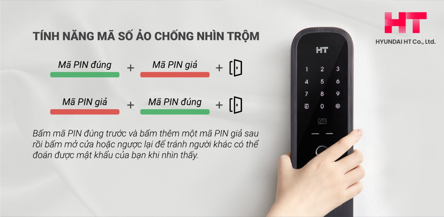 Khóa cửa điện tử Hyundai TDL-A3001FK trang bị mã số ảo giúp bảo mật khi mở cửa. Người dùng có thể nhập thêm các ký tự bất kỳ trước hoặc sau mã số thật, đảm bảo không bị lộ mã ngay cả khi có người nhìn trực tiếp.