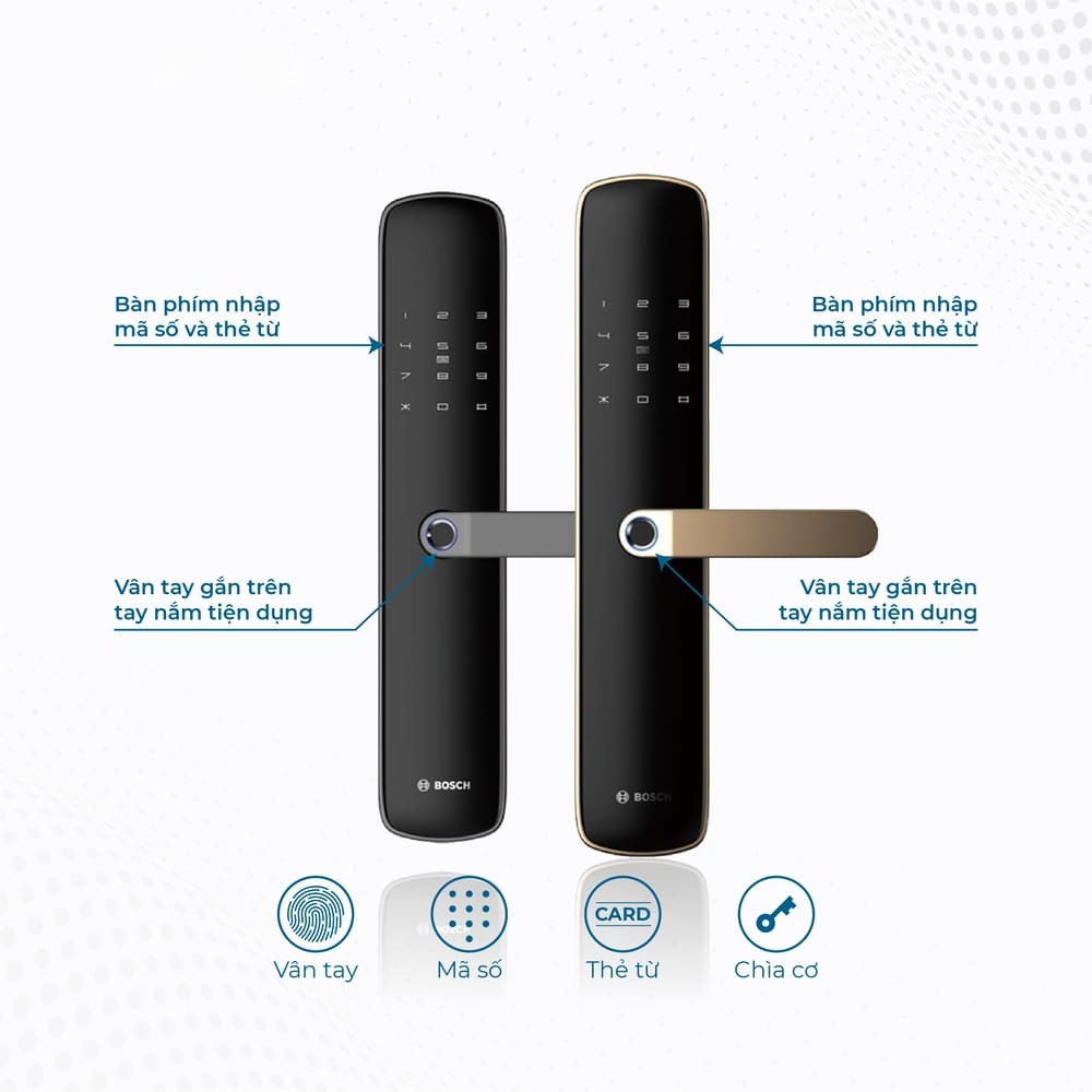 Thẻ từ: Sử dụng công nghệ thẻ thông minh độc quyền với kích thước nhỏ, thuận tiện mang theo. Thẻ từ Bosch là dạng thẻ dữ liệu thông minh chống sao chép và dễ dàng thêm, xóa khi cần thiết.